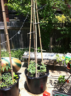 We made our tomato cages out of bamboo, but I haven't finished the cross pieces...I figured I had a couple more weeks before they would be tall enough to actually need them.